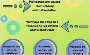 First, it’s important to differentiate between tantrums and meltdowns because for a child with Autism Spectrum Disorder, they are not the same thing. A tantrum is a cluster of undesirable behaviours that are related to the child wanting something that he or she can’t have. Meltdowns for the autistic child are undesirable behaviours that are the result of sensory overload. So, in order to deal with tantrums and meltdowns, you have to identify what you’re dealing with.
