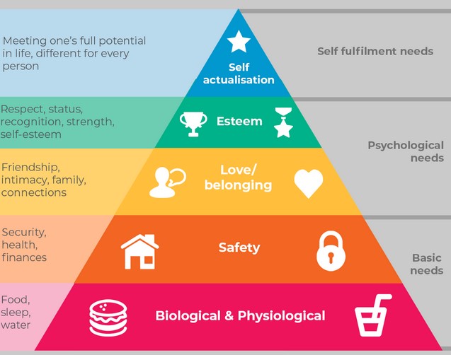 This hierarchy includes everything from basic needs like food and water to more complex ideals like self-fulfilment.