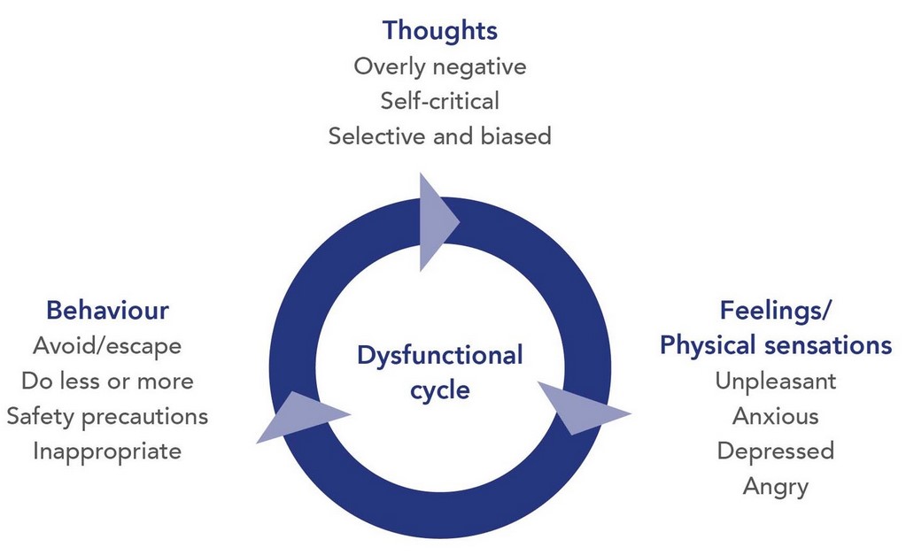 These include unhelpful or problematic thought patterns, learnt patterns of unhelpful behaviour, and problematic core beliefs, such as basic notions about oneself and the universe.